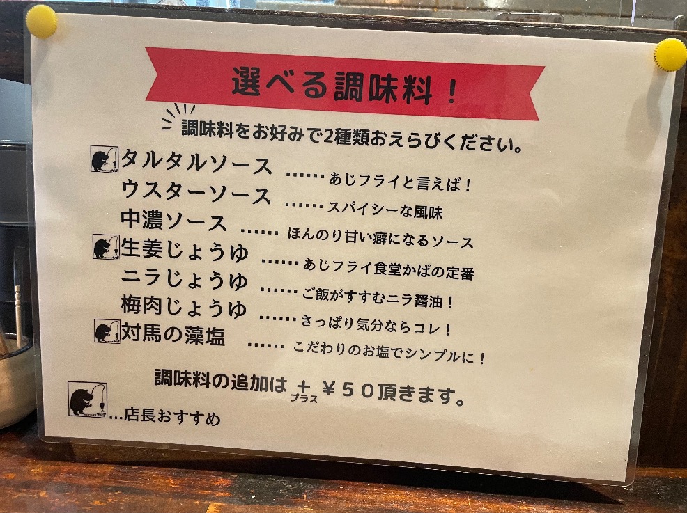 あじフライ定食を注文❕調味料が6種類ご用意されており、お好みで2つ選ぶことができたろっぽ✨調味料は、タルタルソースと生姜じょうゆを選んだろっぽ🎶🎶どちらも相性抜群だったろっぽよ🙆♀️