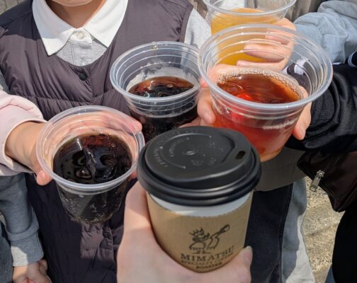 子ども会のジュース、高校生が入れてくれたコーヒー、なが~いロングポテト、さくらぜんざいを注文して、桜の下のベンチで美味しくいただいたろっぽ💖💖